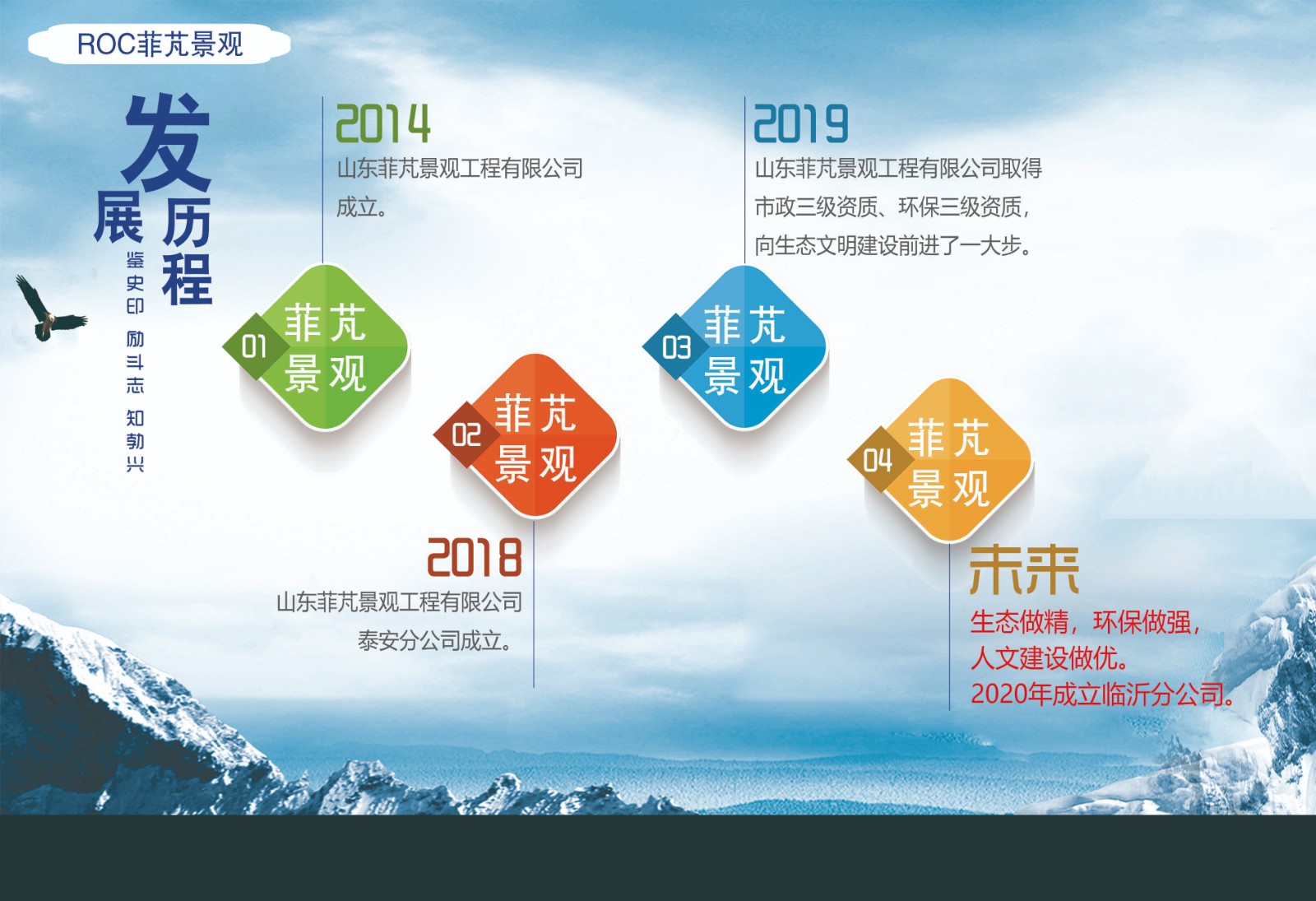 山東菲芃景觀工程有限公司坐落于擁有“七十二名泉”,被稱為“泉城”,素有“四面荷花三面柳,一城山色半城湖”之美譽(yù)的山東省濟(jì)南市,位于高新區(qū)銀荷大廈,創(chuàng)立于2014年。公司業(yè)務(wù)主營(yíng)景觀設(shè)計(jì)、園林工程建設(shè)、綠化養(yǎng)護(hù)、市政工程、環(huán)保工程,為客戶提供專業(yè)的一體化解決方案。